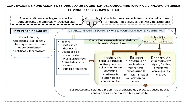Es por ello que se asume el vínculo SEISA-universidad a partir de la relación que se produce entre: el carácter diverso de la gestión de los conocimientos científicos y tecnológicos y el carácter creativo de la innovación, median- te un proceso formativo en el que tiene lugar lo instructivo, educativo y desarrollador.