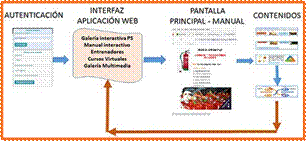Al analizar el diagrama de flujo del proyecto de Realidad Aumentada (RA), en los procesos se constata que el manual interactivo de combate y extinción de incendios está dentro del módulo “contenidos de capacitación a clientes” (ver figura 1), interfaz principal para los clientes, a partir de la cual el usuario tiene acceso a los tutoriales, manuales, multimedia y cursos de capacitación según las áreas donde haya sido registrado por el administrador de cliente, en la pantalla inicial se autentica.